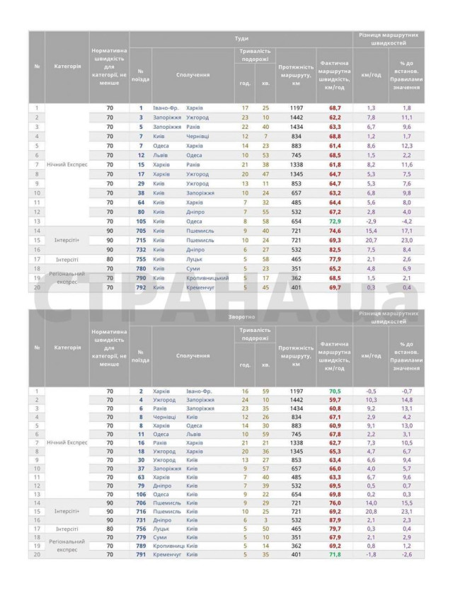 У розпорядженні журналістів опинилася таблиця, на якій показано різницю між нормативною та фактичною швидкістю поїздів. Виходячи з неї, лише три поїзди (№ 105 Київ-Одеса, № 2 Харків–Івано-Франківськ та № 791 Кременчук-Київ) укладаються в норматив за швидкістю руху, решта поїздів відстає. При цьому, цей розрив становить від 2% до 23% – як, наприклад, у випадку з поїздом Інтерсіті+ № 716 Пшемисль-Київ, який для відповідності категорії Інтерсіті+ має їхати зі швидкістю 90 км/год, а фактично рухається зі швидкістю 69 км /год.«Слідує, що з пасажирів неправомірно стягують велику вартість за квитки, при тому, що потяги не відповідають швидкісним категоріям. Це ніби замість бензину А-95 продавати бензин А-76», – каже джерело в «УЗ».