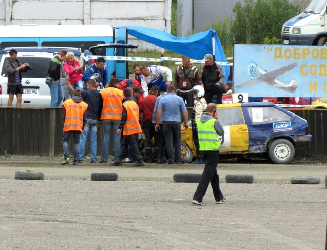 Сьомий заїзд став останнім в турнірі для одного з лідерів літнього сезону білоруса Юрія Гуцалюка. Потрапив під роздачу він внаслідок боротьби між Олегом Лустюк та Віталієм Соколовським, які вирвалися зі старту першими. При спробі обійти цю пару по зовнішній траєкторії він врізається з усього ходу в огорожу, так як в останній момент автомобіль Лустюка зривається зі своєї траєкторії, його починає «хрестити» та Юрію нічого не залишається як полетіти в паркан. Чергову перемогу в заїзді одержав лучанин Олег Лустюк. Треба відзначити, що він став у збірній України основним постачальником очок, поступився тільки в одному заїзді. Дев'ятий заїзд стає останнім і для Сергія Лапицького, якого «вилучили з поля» за некоректну їзду, а результат його анулюється!