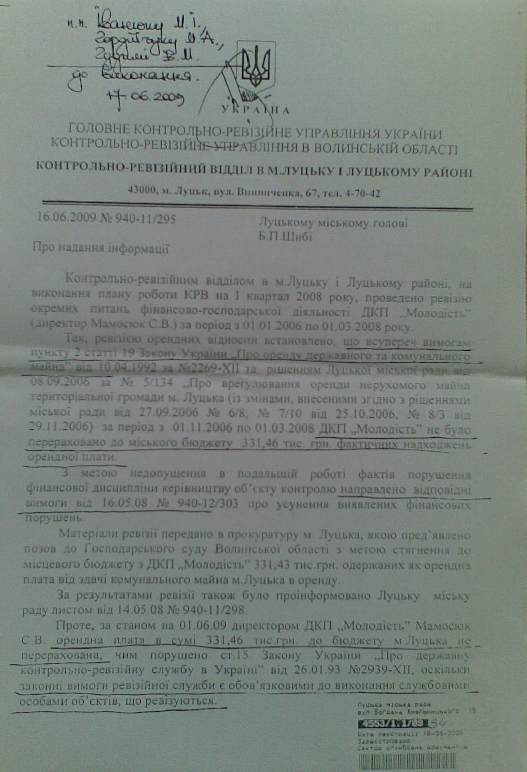Тому луцький міськрайонний КР відділ КРУ просить Богдана Шибу «розглянути питання про відповідність займаній посаді директора ДКП «Молодість» Мамосюк С.В.»