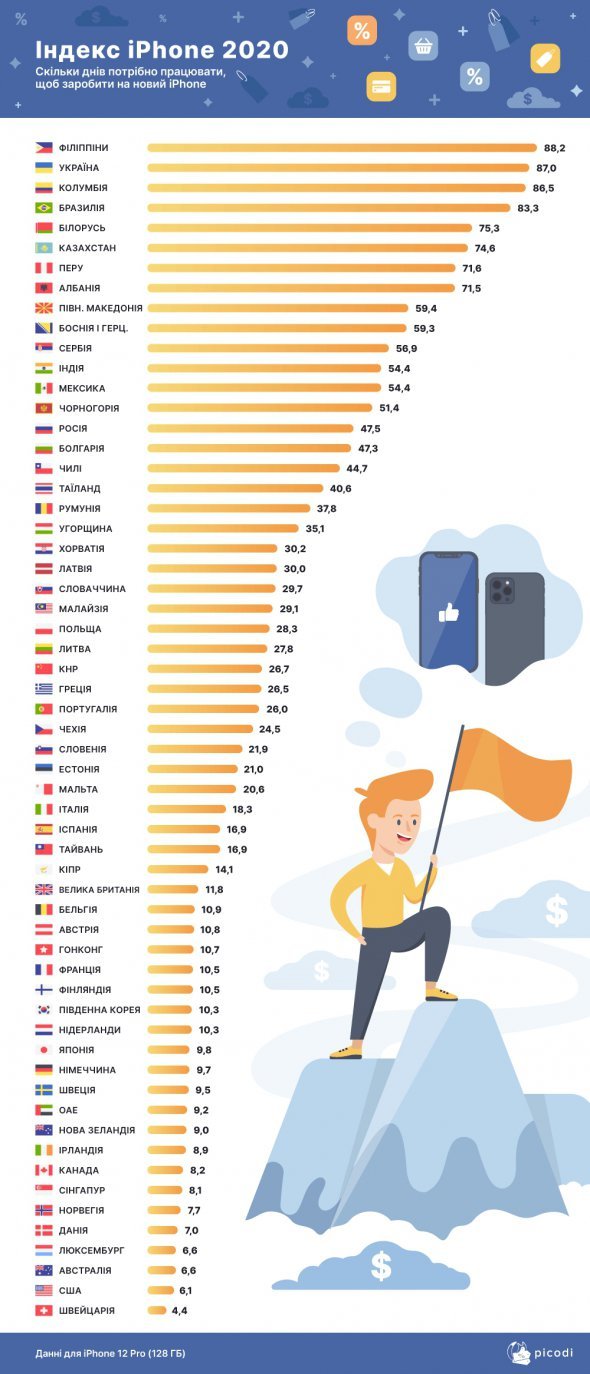 У США, Швейцарії та Австралії високий рівень доходів дозволяє заробити на новий iPhone приблизно за тиждень. У Німеччині та Польщі на новий ґаджет працюватимуть 9,7 і 28,3 робочого дня відповідно. Найгірший результат з усіх країн, де відома ціна нового iPhone 12 Pro, у Філіппінах. Середньостатистичний житель там повинен працювати на iPhone 88,2 дня.