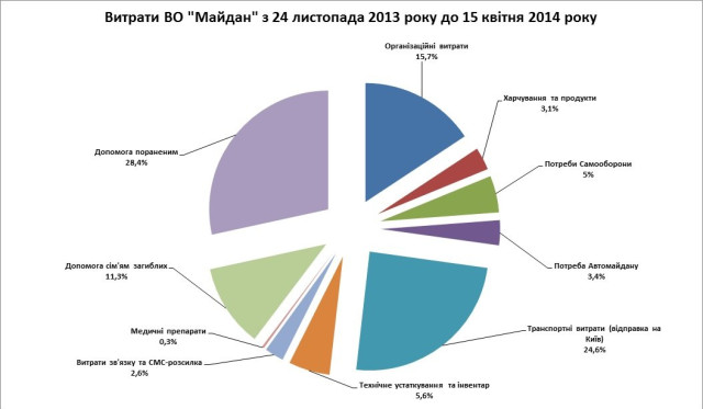 Так, 24,6 % пішло на транспортні витрати (відправка на Київ), 15,7% організація витратила на робочі потреби – це засоби обігріву активістів на Майдані, юридичний захист активістів, друк банерів, поліграфія, дрібна канцелярія та побутова хімія для функціонування наметового містечка.