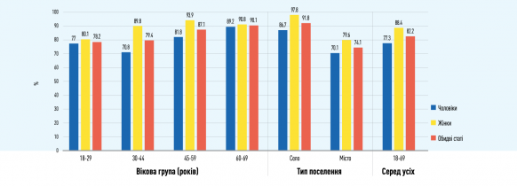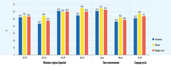 Згідно з дослідженням, в Україні майже три чверті (71,3%) населення користувались автомобілем протягом останніх 30 днів як водій чи пасажир. Цей показник є меншим у найстаршій віковій групі, де автомобілем користувалися 48%. Понад половину (54%) серед респондентів, які користувалися автомобілем протягом останніх 30 днів, не завжди використовували пасок безпеки. Значущих відмінностей у цьому показнику між віковими групами та за статтю не було.Частка користувачів автомобілів, які не завжди використовували пасок безпеки протягом останніх 30 днів, за віком і статтю (%)