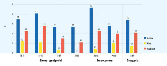 Про керуванням мототранспортним засобом після вживання двох або більше доз алкоголю протягом останніх 30 днів повідомили 2,1% населення, що більш поширене серед чоловіків (3,4%), ніж серед жінок (0,7%), а особливо в сільській місцевості (4,7% серед чоловіків).