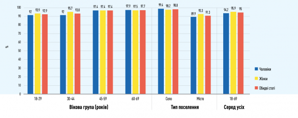 Користування велосипедами також є поширеним в Україні: 40,2% населення повідомили, що користувалися велосипедом протягом останніх 30 днів. Їх використання зменшувалося з віком з 52,3% у віковій групі 18–29 років до 32,1% у віковій групі 60–69. Цей показник також був вищим у сільській місцевості (53,6%), ніж у міській (32,3%). Використання велосипедних шоломів було дуже нечастим випадком. Серед респондентів, які користувалися велосипедами, 95% повідомили, що не користуються шоломами регулярно. Їх використання було нижчим у сільській місцевості (98,8% повідомили, що не користуються ними регулярно), порівняно з 91,3% у містах.Частка велосипедистів, які не завжди використовують шолом, за віком, статтю та типом поселення (%)