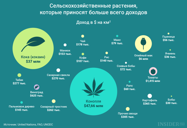 Відповідно даним United Nations, FAO та UNODC, з квадратного кілометра конопель можна зібрати 47,7 млн дол., аналогічна площа коки дасть 37 млн дол., а опіуму — 6 млн дол.