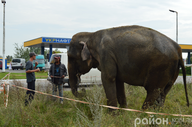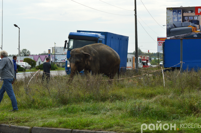 Пересувний цирк розмістився поблизу перехрестя Сільмашу і повороту на Варшавську трасу. Навколо слона змайстрували «огорожу» і власники наглядають, аби тварина не вибігла на дорогу.