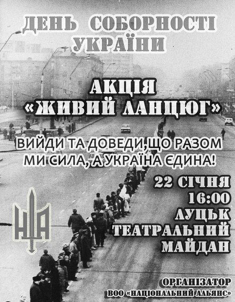 Беручи приклад з першого «живого» ланцюга в Україні, який утворили в січні 1990 року і який з’єднав Київ та Львів, 22 січня 2014 року у Луцьку, як і по всій Україні, у 95 річницю проголошення Акту Соборності українських земель, відбудетьсягромадська акція відзначення Дня Соборності України. Зокрема, спільнота у соцмережі Вконтакте групи Наш Луцьк Life закликає 22 cічня 2014 року прийти на Театральний майдан Луцька, по можливості з національною символікою (синьо-жовті прапори, прапорці, стрічки, бодіарт на обличчі). І чим більше - тим краще.