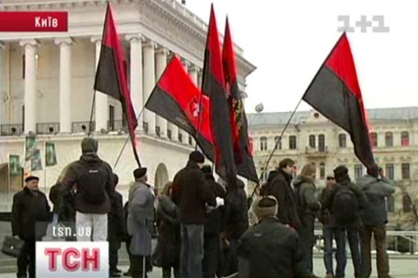 Час від часу вони скандували: "Слава Україні - Героям слава", "Слава нації - смерть ворогам", "Шухевич і Бандера - наші герої".