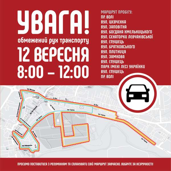 Через змагання буде перекритий рух на деяких вулицях за маршрутом півмарафону: проспект Волі, вулиця Шевченка, вулиця Заповітна, вулиця Богдана Хмельницького, вулиця Сенаторки Левчанівської, вулиця Ковельська (частково), вулиця Братковського, вулиця Кафедральна, вулиця Замкова, вулиця Глушець.