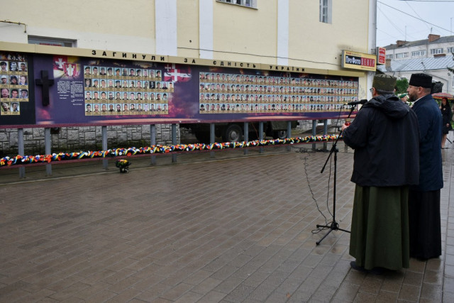 Спочатку біля пам’ятного фотостенду «Герої Небесної Сотні – Загинули за Єдність України», що на Театральному майдані у місті Луцьку, представники духовенства відслужили панахиду.«Єдине, що потрібно сьогодні нашим полеглим захисникам, – це пам'ять про них та їхні сім'ї, це молитва за спокій їхніх душ і побудова тієї України, за яку вони віддали свої життя, – звернувся до присутніх капелан Михайло Бучак. – Сьогодні з нами плачуть душі полеглих українських героїв. Плаче земля Іловайська, Дебальцевого, Донецького аеропорту, плаче Зеленопілля і Слов'янськ, плаче Бог і плаче Україна. Будемо вірити, що Бог дасть нам сили звести пам’ятник цим героям, а пам’ятником для них буде світла, могутня, незалежна, вільна українська держава».