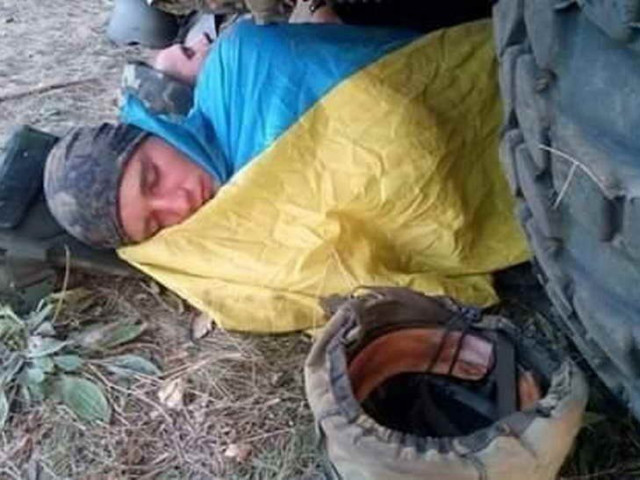 На фотографії кілька бійців сплять під БТРом, один з вояків – закутаний в державний прапор.
