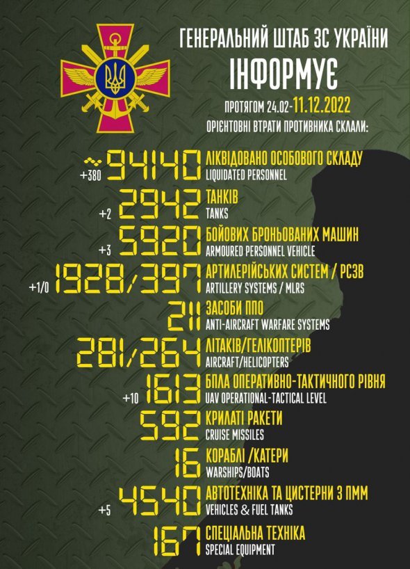 Загальні бойові втрати Росії на ранок 11 грудня становлять 94 140 осіб. За добу лави «200-х» поповнили ще понад 380 російських загарбників.
