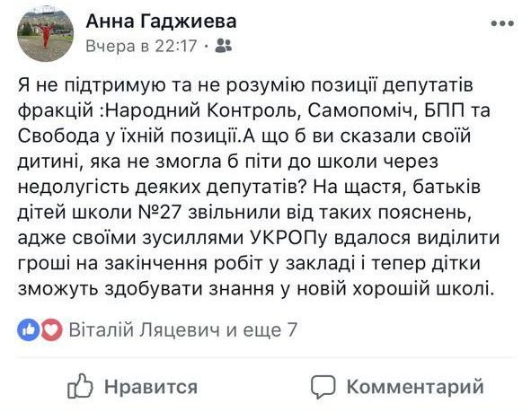«З усією повагою до бійців АТО і з розумінням необхідності будівництва реабілітаційного центру було обрано найоптимальніший варіант, який не зашкодить будівництву центру і при цьому дозволить відкрити двері для майбутніх учнів довгоочікуваної школи». Натомість депутати фракцій «БПП», «Свобода», «Самопоміч» та «Народний Контроль», зі слів радника міського голови Ігоря Поліщука, саботували прийняття рішення, яке дозволить дітям розпочати новий навчальний рік в сучасній школі. За виключенням деяких осіб, фракції в повному складі не з’явились на сесійне засідання. Зокрема, не прийшов на сесію і депутат від «Самопомочі» Тарас Шляхтич, на окрузі якого і знаходиться школа.