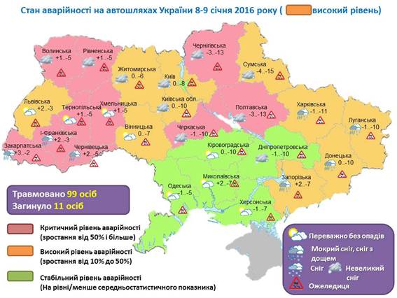 За минулу добу в Україні в ДТП загинули 11 осіб (серед них один лучанин), ще 99 людей отримали травми. Збільшення кількості аварій пов'язане з погіршенням погоди.