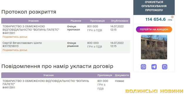 Вторгувати за це приміщення планували мінімум 114 тисяч гривень. Проте під час аукціону ціна суттєво зросла. Переможцем стало ТзОВ «Волинь Палетс», яке запропонувало 801 тисячу гривень.