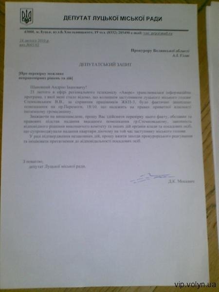 Як повідомляє Волинський інформаційний портал, у запиті зокрема зазначається: «21 лютого в ефірі регіонального телеканалу «Аверс» транслювалася інформаційна програма, з якої мені стало відомо, що колишнім заступником Луцького міського голови Стемковським В.В., за сприяння працівників ЖКП-3, було фактично захоплено помешкання на проспекті Перемоги ___, що належить на правах приватної власності іноземному громадянину».