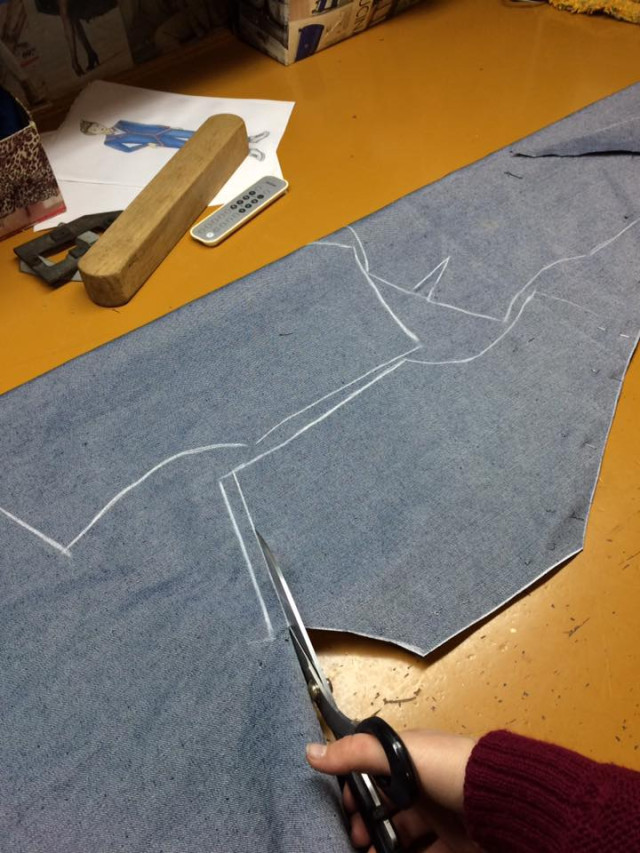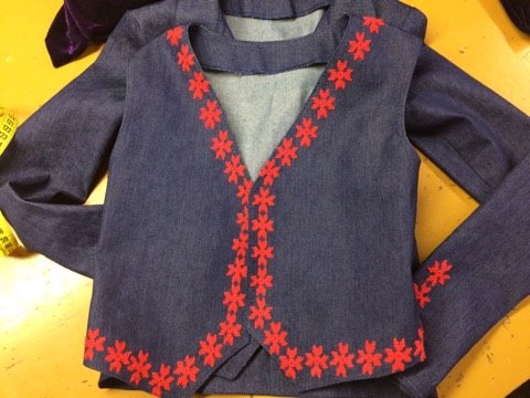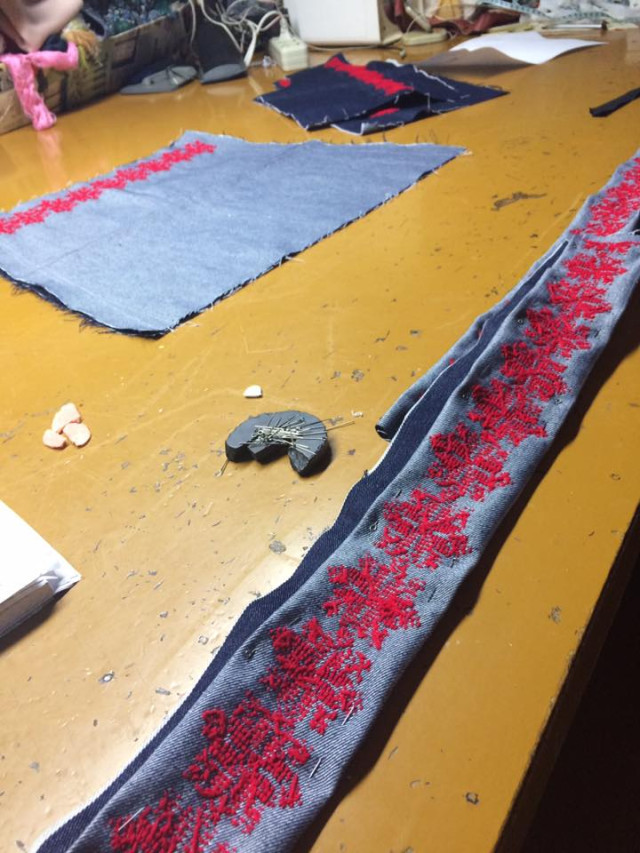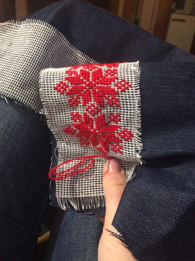 Дівчина каже, що разом з керівником проекту Анною Дідух довго думали над вибором тканини. Адже вона має бути хорошої якості. Зупинилися на джинсовій, оскільки ця тканина практична, зручна та модна. Непростим був вибір кольорової гами. Для нашого краю притаманні чорний (символізує землю), синій (воду) та червоний (кров) кольори. Тож обрали темно-синій джинс, на якому червоними нитками вишитий традиційний волинський орнамент – зірка, що складається з геометричних фігур.