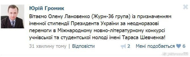 Зі слів Олени, про розмір стипендії її не повідомили, однак торік він становив 1000 гривень щомісяця протягом року. "Я, звісно, відчуваю радість, оскільки у минулому році теж брала участь у цьому конкурсі й на всеукраїнському рівні посіла ІІ місце, за яке нагород не було=)", - коментує дівчина для Інформаційного агентства Волинські Новини.