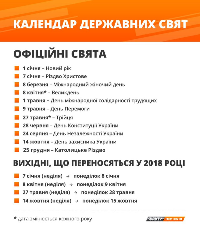 В Україні офіційно затверджені 11 днів державних свят, які є вихідними. Аби не заплутатися та не забути про жодне з них, створили зручний календар на 2018 рік.