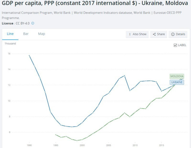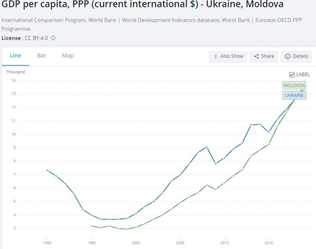 За ВВП на душу населення з врахуванням ПКС (паритету купівельної спроможності): Україна $13 341,2, Молдова $13 574,1.