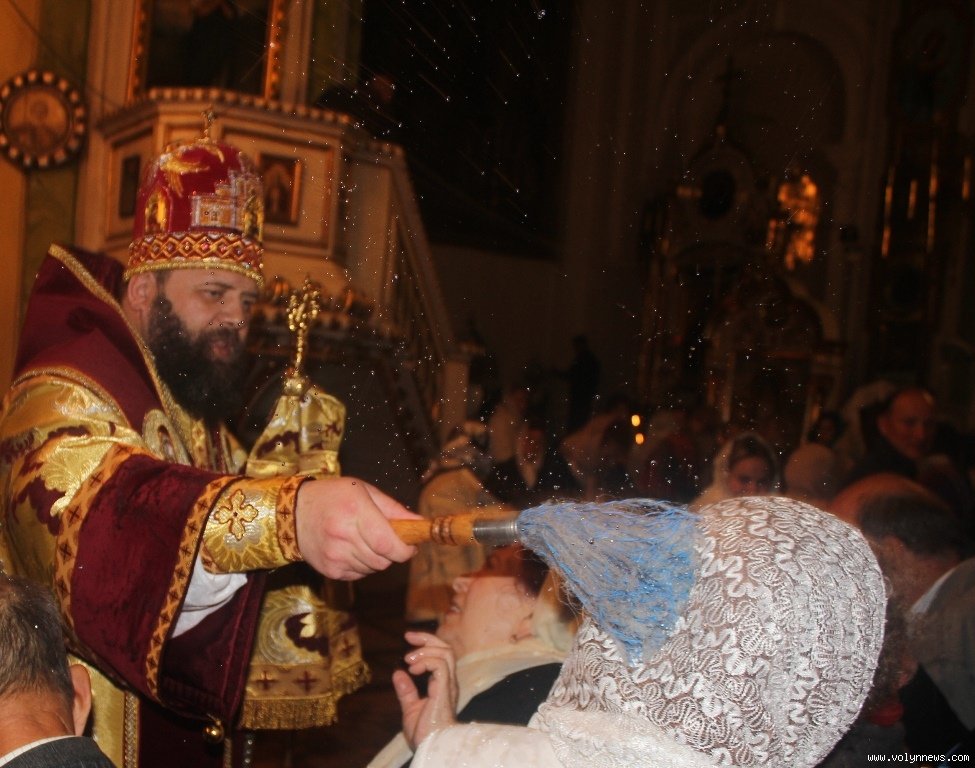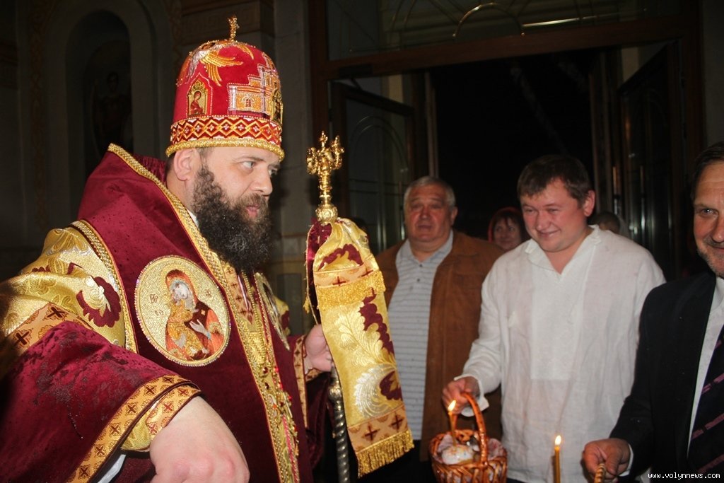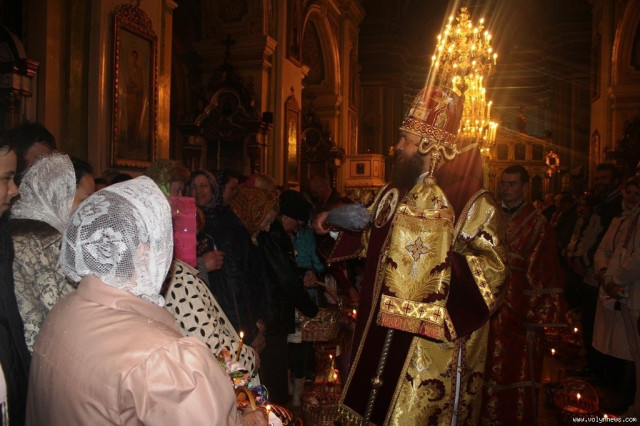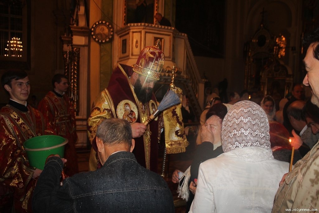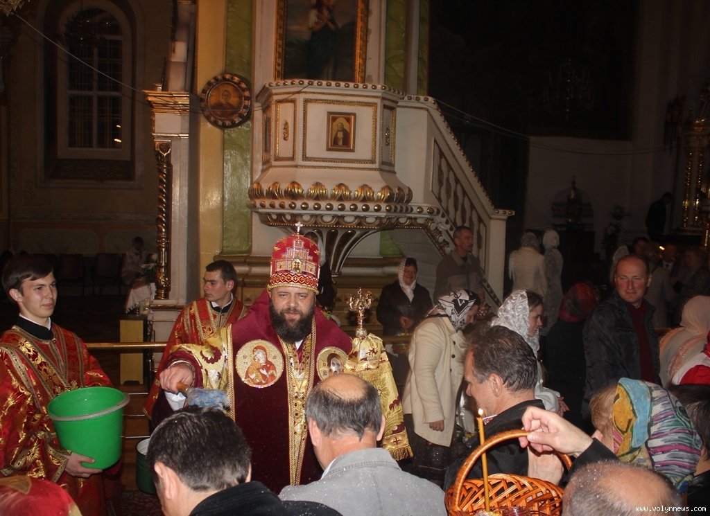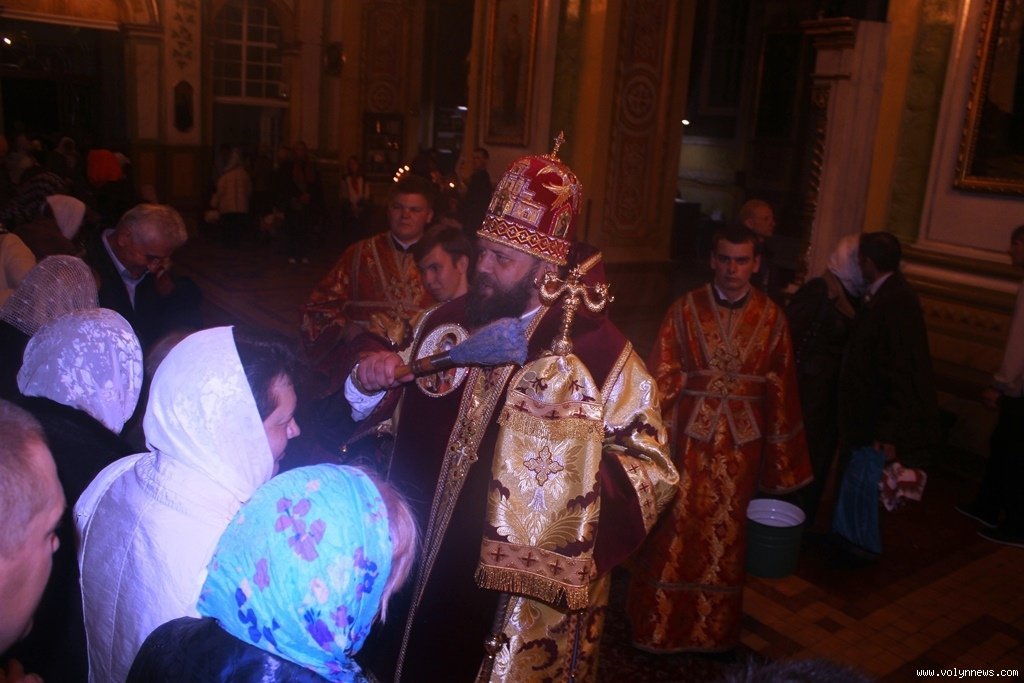 Великодня всенічна та святкове освячення пасок відбулись у Луцькому кафедральному Свято-Троїцькому соборі. Священики жартували та закликали волинян бути позитивними.