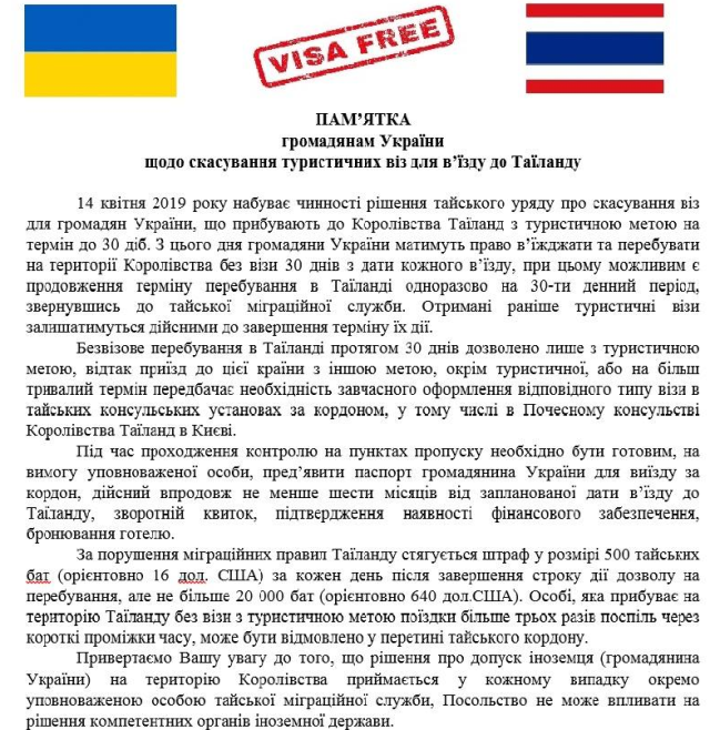 Українці зможуть перебувати на території країни без візи до 30 днів. Безвізове перебування у Таїланді дозволене лише з туристичною метою. Українцям потрібна буде віза, якщо вони їдуть у країну з іншою метою або термін їх перебування перевищує 30 днів.
