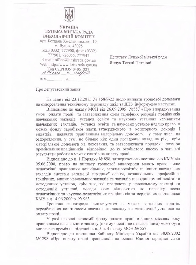 На запит депутата від фракції УКРОП надійшла відповідь, що засвідчує: техпрацівники луцьких шкіл та ДНЗ отримають матеріальну допомогу на оздоровлення.