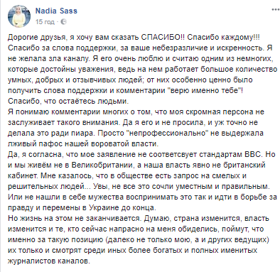 При цьому свій певший пост у соцмережі про звільнення Сасс видалила.