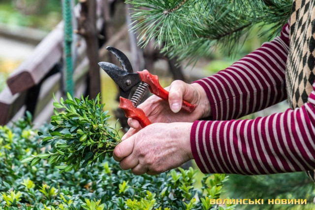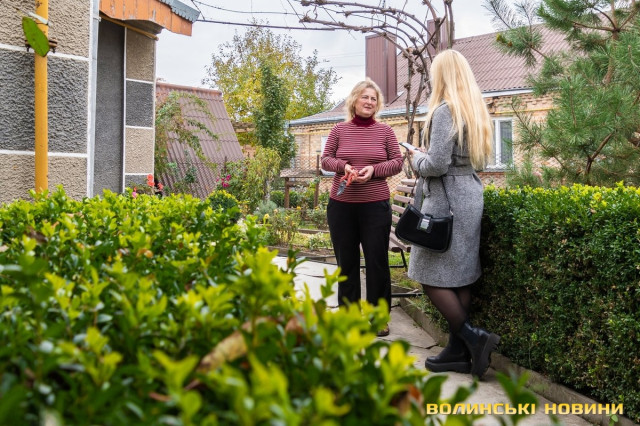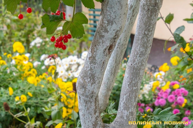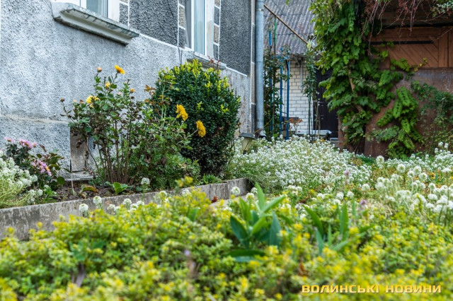 «Отут попід хатою в нас навесні тюльпани цвітуть, – показує. А там – бачите стебла – то півонії. Одні то звичайні, червоні, а ще в нас є кущ півоній незвичайного оливкового кольору. От приходьте наступного року в червні – побачите, які вони пишні. А отам-о, де стійка, в нас клематиси ростуть. То теж вельми гарні квіти. Але вже відцвіли».Алла Андрощук у себе на подвір’ї саме підстригає кущики самшиту. Каже, їх дуже любить її донька. А сама пані Алла, попри неабияку зайнятість ( жінка працює у ВНУ імені Лесі Українки), усе ж знаходить час, аби приділити увагу улюбленим квітам, яких у неї – до кольору до вибору. Каже, любов до них успадкувала від мами.«У мене дуже багато квітів – і лілійники, й іриси, й гортензії, і кали, і, звісно ж, улюблениці-троянди, – перелічує. – Правда, майже все вже поперецвітало, оце ще хризантеми хіба радують цвітом».На порозі примостилися вазонки з різнокольоровими калачиками. Біля воріт – кущ калини, гілки якого донизу хилять китиці ягід. Його, каже жінка, посадив її чоловік.«Він у мене теж шанувальник рослин, – каже пані Алла. – Щоправда, я по квітах, а він – по деревах. Сам садить, сам щеплює, доглядає».