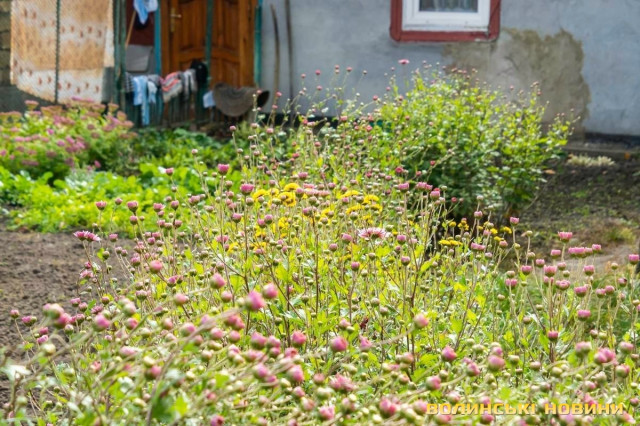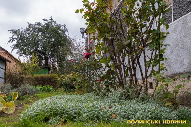 Клумбу прикрашають низькорослі хризантеми, а солодкий запах дрібної білесенької медунки лоскоче ніздрі.А за хатою – царство троянд. Незважаючи на холодні ночі, вони не померзли й тішать господарів красою та ароматом.