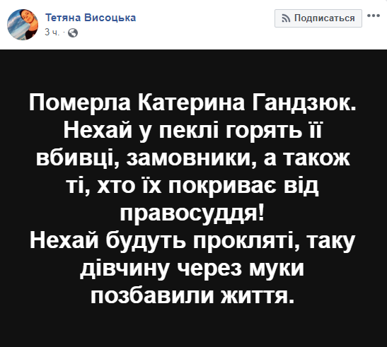 «Померла Катерина Гандзюк. Нехай в пеклі горять її вбивці і замовники, а також ті, хто їх покриває від правосуддя! Нехай будуть прокляті, таку дівчину з муками позбавили життя», - пише журналіст Тетяна Висоцька.