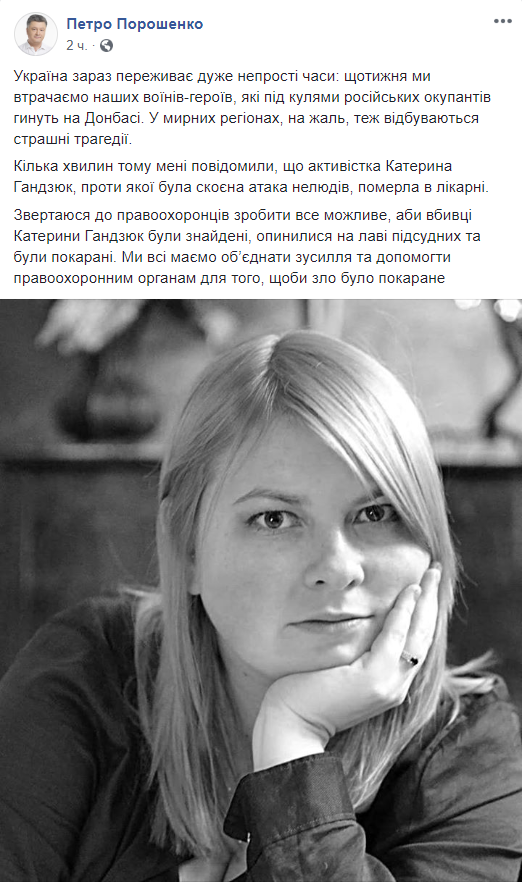 «Україна зараз переживає дуже непрості часи: щотижня ми втрачаємо наших воїнів-героїв, які під кулями російських окупантів гинуть на Донбасі. У мирних регіонах, на жаль, теж відбуваються страшні трагедії. Кілька хвилин тому мені повідомили, що активістка Катерина Гандзюк, проти якої була скоєна атака нелюдів, померла в лікарні. Звертаюся до правоохоронців зробити все можливе, аби вбивці Катерини Гандзюк були знайдені, опинилися на лаві підсудних та були покарані. Ми всі маємо об’єднати зусилля та допомогти правоохоронним органам для того, щоби зло було покаране», - написав у себе на Фейсбук Порошенко.