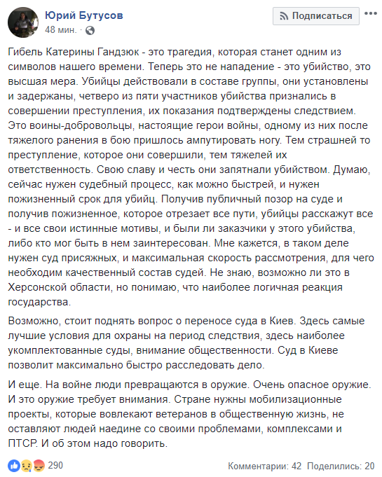 «Загибель Катерини Гандзюк - це трагедія, що стане одним із символів нашого часу. Тепер це не напад - це вбивство, це вища міра. Вбивці діяли в складі групи, вони встановлені і затримані, четверо з п'яти учасників вбивства зізналися в скоєнні злочину, їх показання підтверджені слідством. Це воїни-добровольці, справжні герої війни, одному з них після важкого поранення в бою довелося ампутувати ногу. Тим страшніший той злочин, який вони здійснили, тим важча їх відповідальність. Свою славу і честь вони заплямували вбивством. Думаю, зараз потрібен судовий процес, як можна швидше, і потрібен довічний термін для вбивць. Отримавши публічну ганьбу на суді і отримавши довічне, яке відрізає всі шляхи, вбивці розкажуть все - і всі свої справжні мотиви, і чи були замовники у цього вбивства, чи хто міг бути в ньому зацікавлений. Мені здається, в такій справі потрібні суд присяжних і максимальна швидкість розгляду, для чого необхідний якісний склад суддів. Не знаю, чи можливо це в Херсонській області, але розумію, що найбільш логічна реакція держави», - пише журналіст Юрій Бутусов.