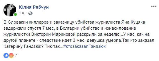 «У Словаччині кілерів і замовницю вбивства журналіста Яна Куцяк затримали через 7 місяців. У Болгарії вбивство і згвалтування журналістки Вікторії Маринової розкрили за тиждень ... У нас, як на іншій планеті, - слідство триває 3 місяці, дівчина померла. Так хто замовив Катерину Гандзюк?» - пише журналіст Юлія Рябчун.