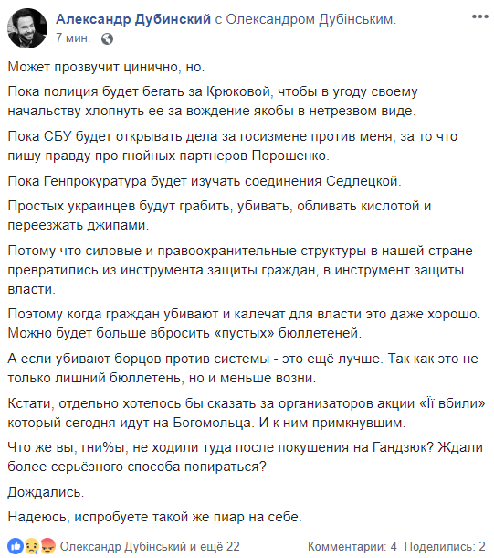 Що ж ви, гни% и, не ходили туди після замаху на Гандзюк? Чекали серйознішого способу попіаритися?