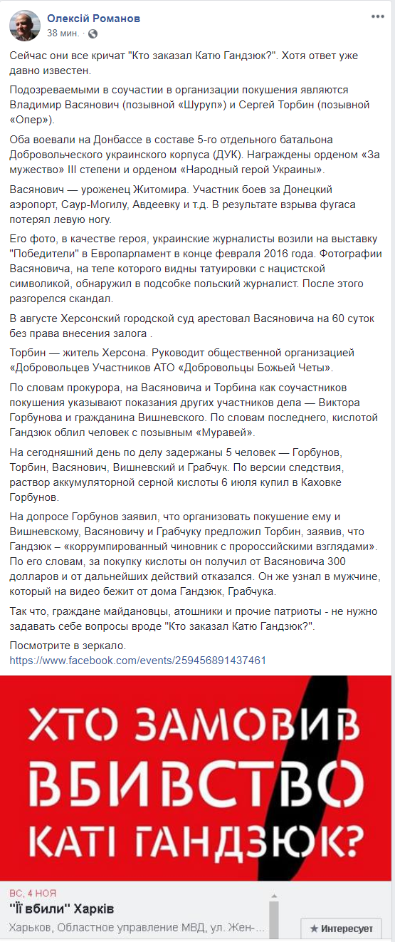 «Зараз вони всі кричать: «Хто замовив Катю Гандзюк?» Хоча відповідь вже давно відома. Підозрюваними у співучасті в організації замаху є Володимир Васянович (позивний« Шуруп ») і Сергій Торбін (позивний «Опер»). Обидва воювали на Донбасі в складі 5-го окремого батальйону Добровольчого українського корпусу (ДУК). Нагороджені орденом «за мужність» III ступеня та орденом «Народний герой України». Васянович - уродженець Житомира. Учасник боїв за Донецький аеропорт, Саур-Могилу, Авдіївку і т. д. У результаті вибуху фугасу втратив ліву ногу. Його фото у якості героя українські журналісти возили на виставку «Переможці» в Європарламент наприкінці лютого 2016 року. Фотографії Васяновича, на тілі якого видно татуювання з нацистською символікою, виявив в підсобці польський журналіст. Після цього розгорівся скандал. У серпні Херсонський міський суд заарештував Васяновича на 60 діб без права внесення застави. Торбін - житель Херсона. Керує громадською організацією добровольців-учасників АТО «Добровольці Божої Пари», - пише юрист Олексій Романов.