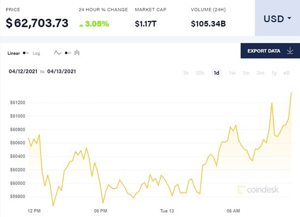 Ціна Bitcoin вперше перевищила $62 тисячі