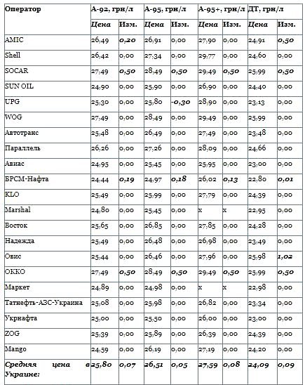 В мережі SOCAR і ОККО дизельне паливо і всі види бензину подорожчали на 50 коп/л: бензин А-92 - до 27,49 грн/л, бензин А-95 - до 28,49 грн/л, бензин А-95 + - до 29,49 грн/л, ДП - до 25,99 грн/л. Також на 50 коп/л дизпаливо подорожчало в мережі AMIC (до 24,91 грн/л).