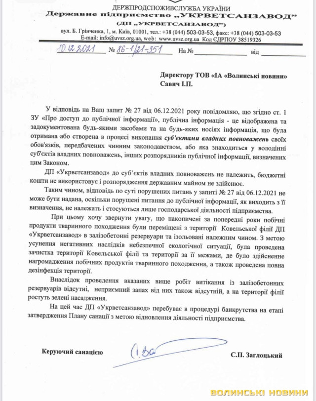 У жовтні 2020 року Ковельська місцева прокуратури Волинської області скерувала до суду обвинувальний акт у кримінальному провадженні стосовно директора Ковельської філії Державного підприємства «Укрветсанзавод».