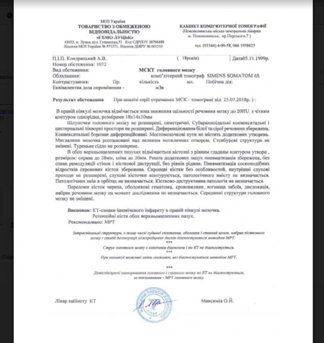 Арсеній три тижні лікувався в неврологічному відділенні Нововолинської центральної міської лікарні. На КТ головного мозку було виявлено ознаки ішемічного інсульту в правій півкулі мозочку та дві ретенційні кісти.