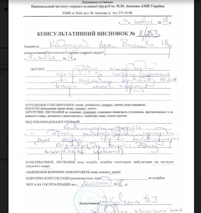Людмила розповідає, що почали проходити усі можливі обстеження у столичних лікарнях, робити МРТ різних органів. А пройти УЗД серця підказав декан університету, в якому навчається Арсеній. При обстеженні виявили вроджену ваду серця – дефект міжпередсердної перегородки.