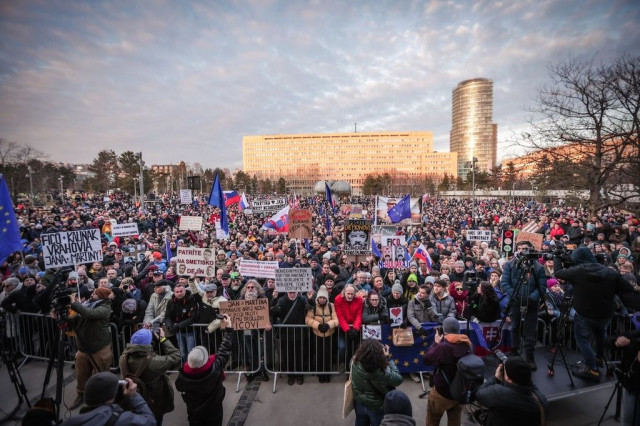 Тисячі людей вийшли на протест у столиці Братиславі та інших містах Словаччини в п’ятницю, 21 лютого, вимагаючи відставки прем’єр-міністра Роберта Фіцо.