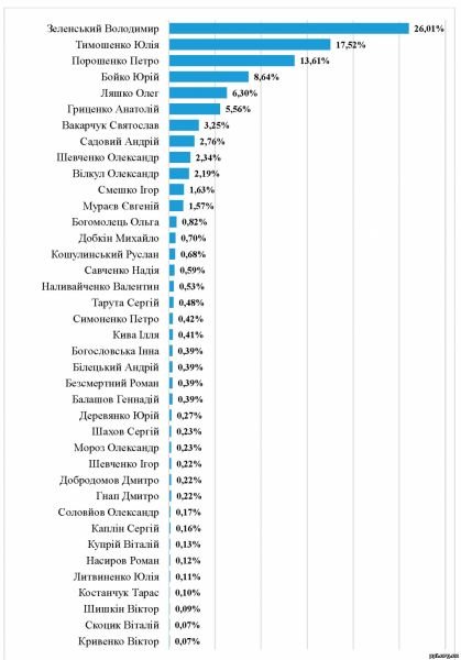 За результатами опитування громадської думки, проведене 26 січня 2019 року, до першої четвірки рейтингу кандидатів на посаду президента України потрапляють Володимир Зеленський - 26,01%, Юлія Тимошенко - 17,52%, Петро Порошенко - 13,61% та Юрій Бойко - 8,64% електоральної підтримки виборців.