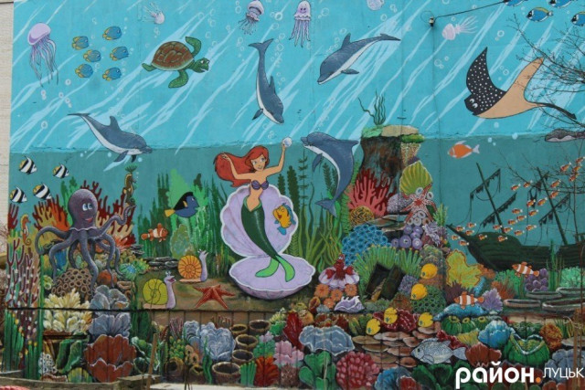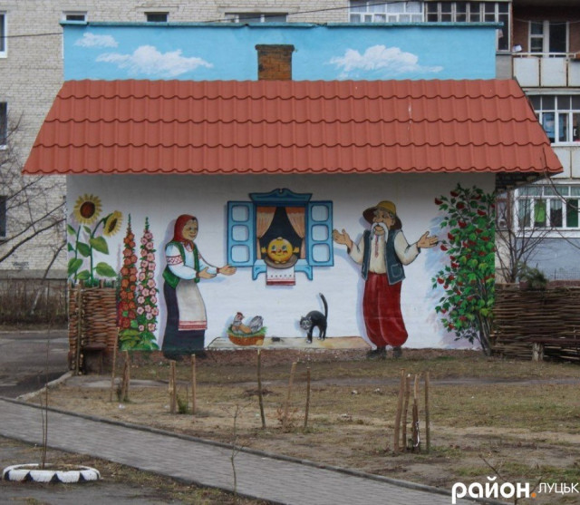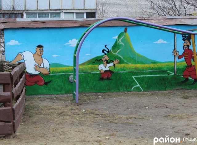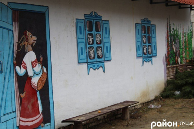 На одній зі стін багатоповерхівки зображено підводний світ, на іншій будівлі – персонажі з казки «Коза та семеро козенят». Ще на одній намальовані Колобок, дід та баба. Є й персонажі з відомого мультфільму про козаків.