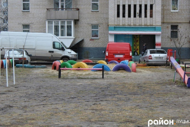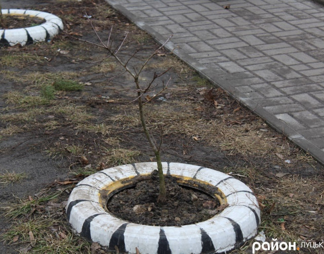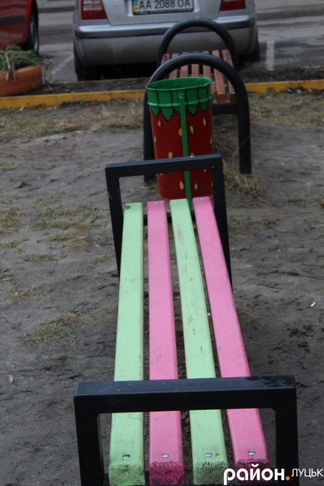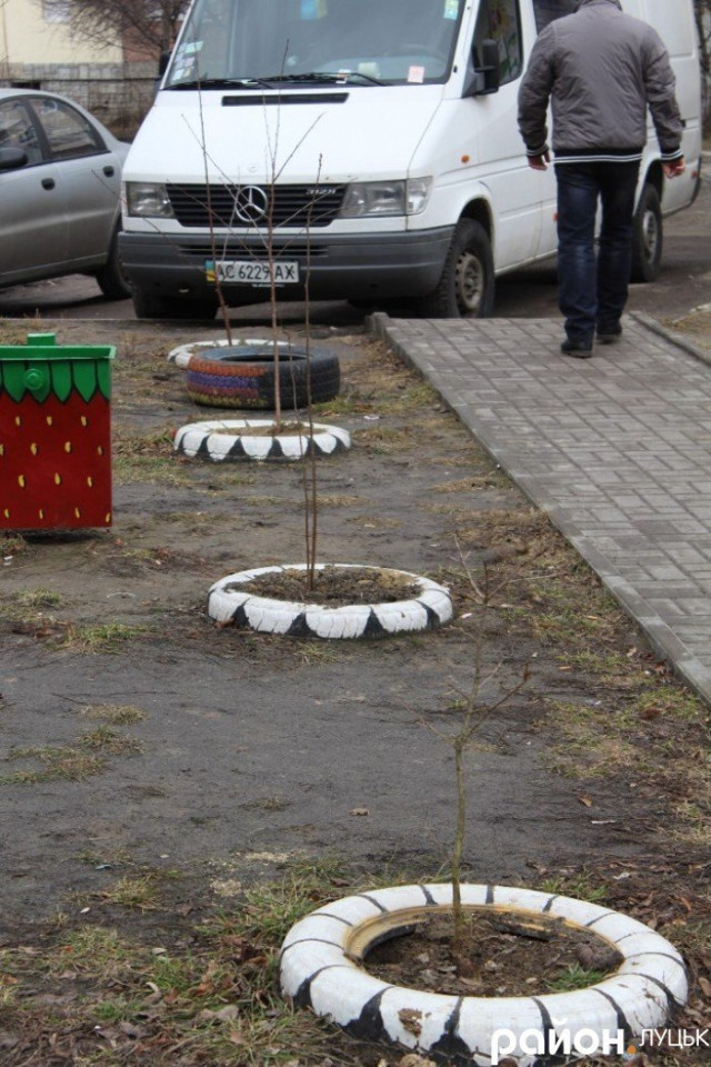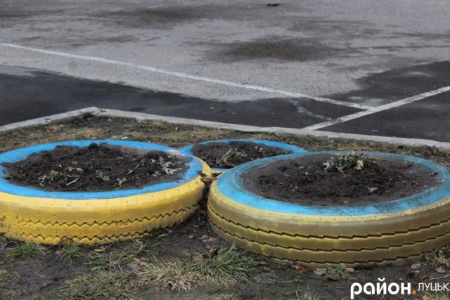 Художник оформив і дитячий майданчик: колеса з автомобілів перетворилися на кольорові клумби, в яких улітку висаджують квіти.
