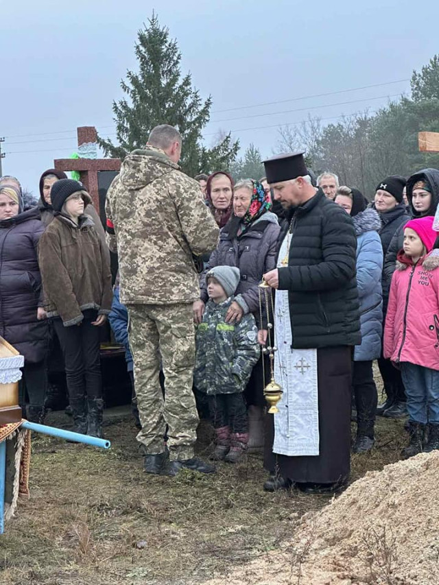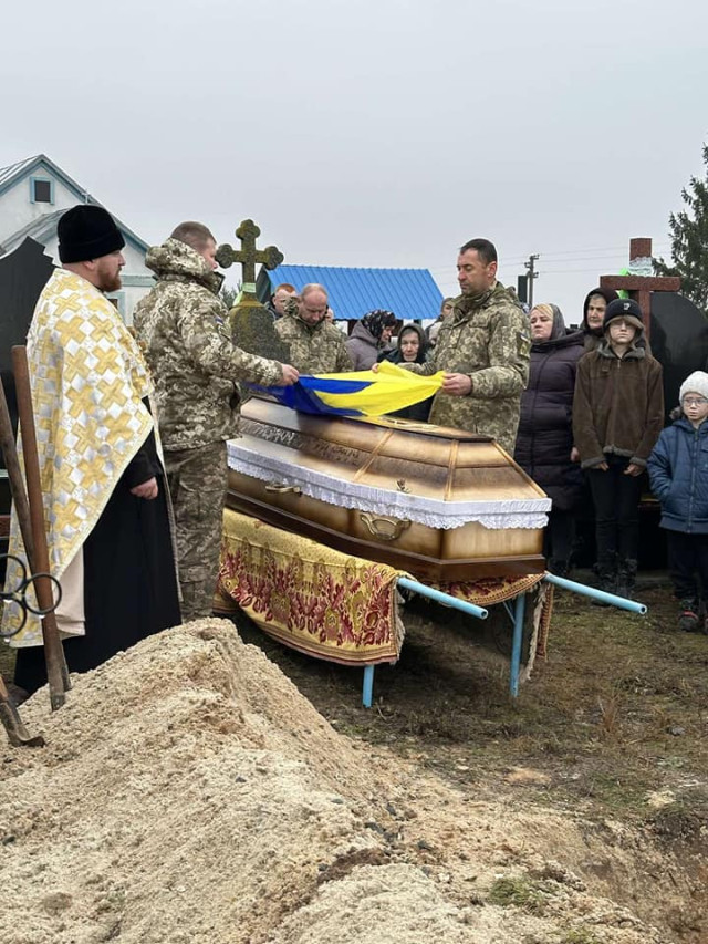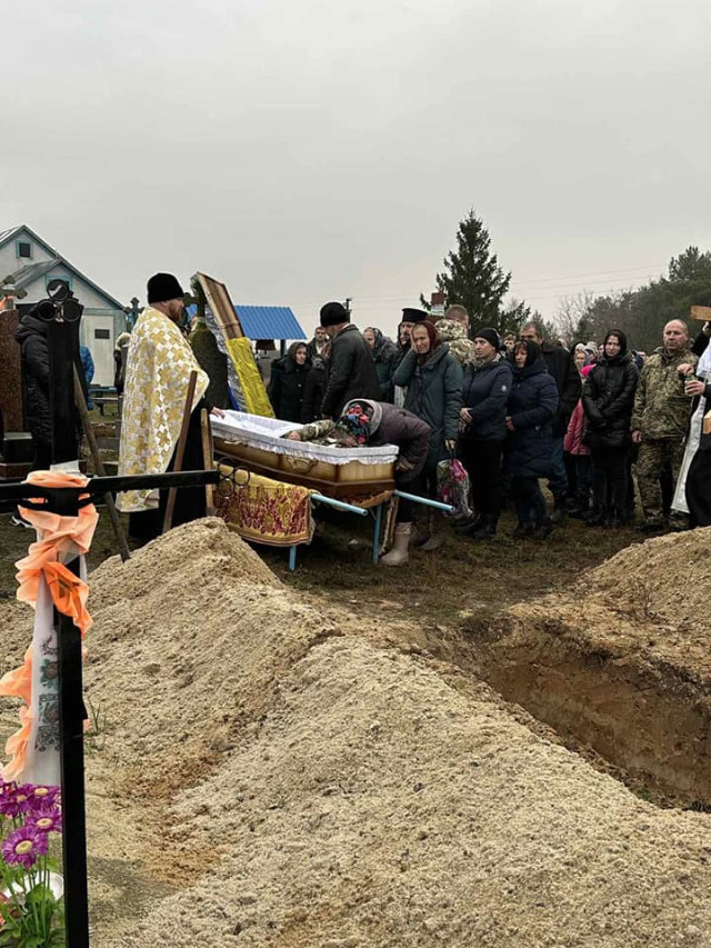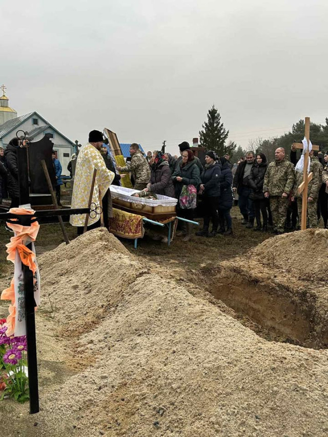 Поховали захисника України з усіма військовими почестями на сільському кладовищі.