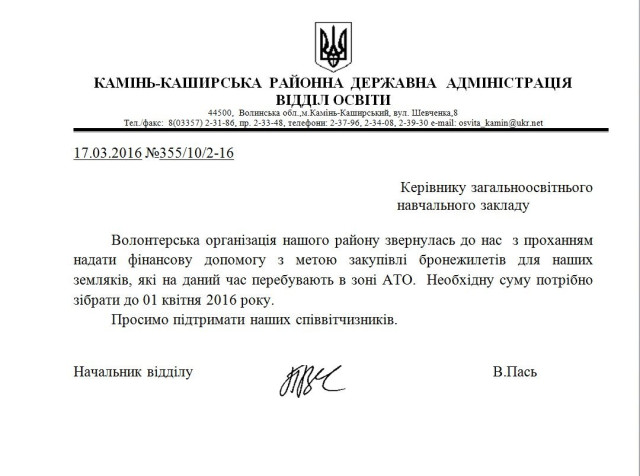 Намагаючись допомогти, Богдан Пташник звернувся до місцевого населення з закликом організувати збір коштів на імпортні засоби захисту. Участь у цьому зголосився взяти начальник відділу освіти Камінь-Каширської РДА Віктор Пась. Він і звернувся з проханням до колективів місцевих шкіл допомогти у зборі коштів.