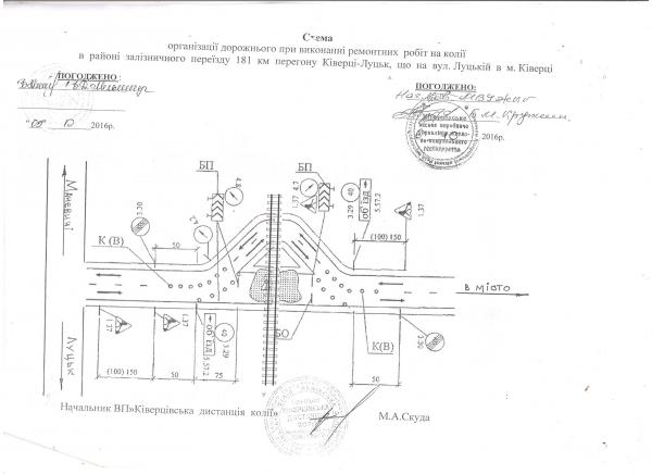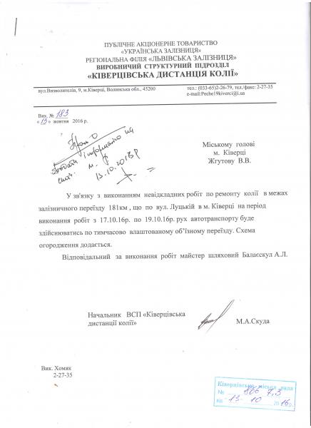 «У зв’язку з виконанням невідкладних робіт по ремонту колії в межах залізничного переїзду 181 км, що на вулиці Луцькій в місті Ківерці на період виконання робіт з 17.10.2016 року по 19.10.2016 року рух автотранспорту буде здійснюватись по тимчасово влаштованому об’їзному переїзду», - йдеться у повідомленні.