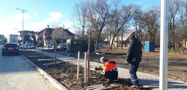 Працює колектив КП «Добробут». Біля кожної сакури також вони висаджують кущі кизильника блискучого, який згодом сформує живопліт.