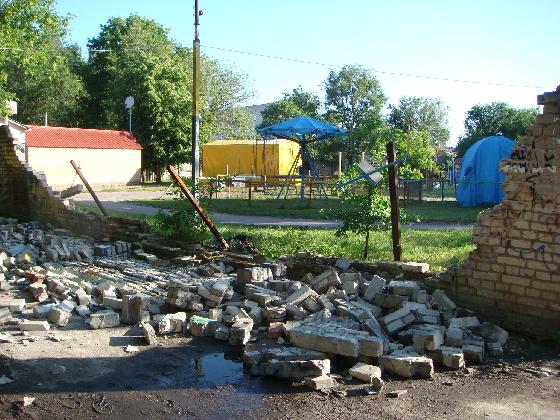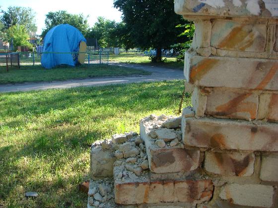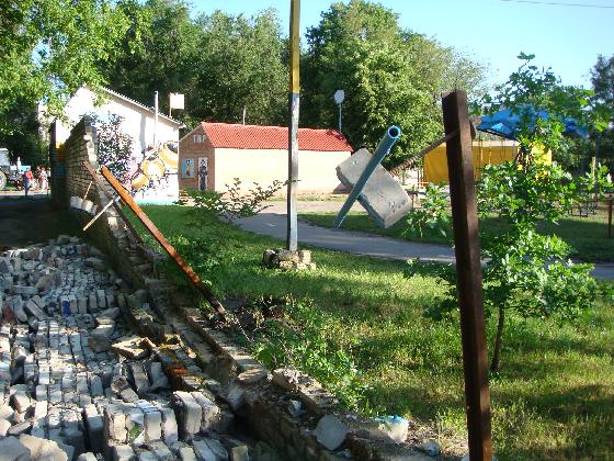 До слова, частина цегляного паркану, яким огороджене містечко, у свій час теж падала. Тоді вдалося залатати дірку тією ж цеглою, яка залишилася непобитою.